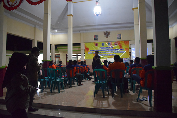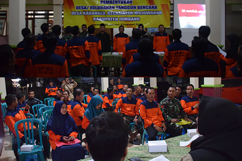 JOMBANGKAB - Mojowarno, Bertempat di Balai Desa Karanglo Kecamatan Mojowarno Kabupaten Jombang, pada hari Kamis tanggal 30 Januari 2020 pukul 19.20 wib Badan Penanggulangan Bencana Daerah (BPBD) Provinsi Jawa Timur berkerjasama BPBD Kab. Jombang menggelar Pembentukan Desa Tangguh Bencana tahun 2020. Kegiatan digelar mulai 30 Januari hingga 5 Pebruari 2020.