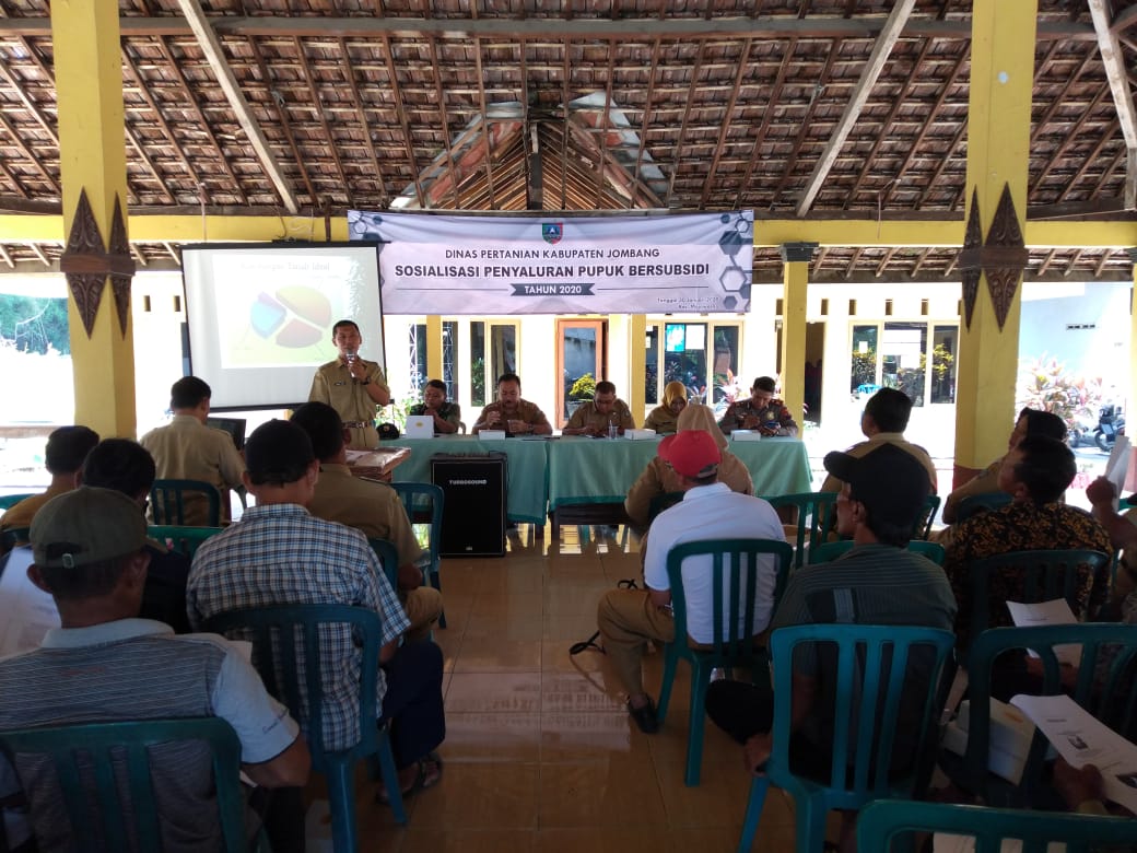 JOMBANGKAB - Mojowarno ,hari Senin tanggal 3 Pebruari 2020 Pukul 09.00 wib Kegiatan Sosialisasi Penyaluran Pupuk Bersubsidi Tahun 2020 dari Dinas Pertanian Kabupaten Jombang di Balai Desa Mojowangi Kecamatan Mojowarno Kabupaten Jombang. Adapun yang hadir Seketaris Dinas Pertanian Supriadi, Kasi sarana prasarana Distan Kabupaten Jombang Novi Hastuti Purwitasari,SPT, Camat Mojowarno Arief Hidajat . SH,MSi, Kapolsek Mojowarno Akp.Yogas.SH, Batituud Koramil 0814/15 Mojowarno Pelda Edi Purwanto (mewakili Danramil), Koodinator PPL Kecamtan Mojowarno Wiwik Budiarti, 19 Kepala Desa Se- Kecamatan Mojowarno, Perwakilan Gapoktan Se-Kecamatan Mojowarno, PPL Se-Kecamatan Mojowarno dan Jumlah yang hadir ± 70 Orang.