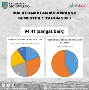 - Pelaksanaan pelayanan publik di Kecamatan Mojowarno Kabupaten Jombang, secara umum mencerminkan tingkat kualitas yang Sangat Baik dengan nilai SKM 94,41. Hal ini juga ditunjukkan dengan konsistensi peningkatan kinerja penyelenggaraan pelayanan publik dari tahun 2020 hingga 2023.