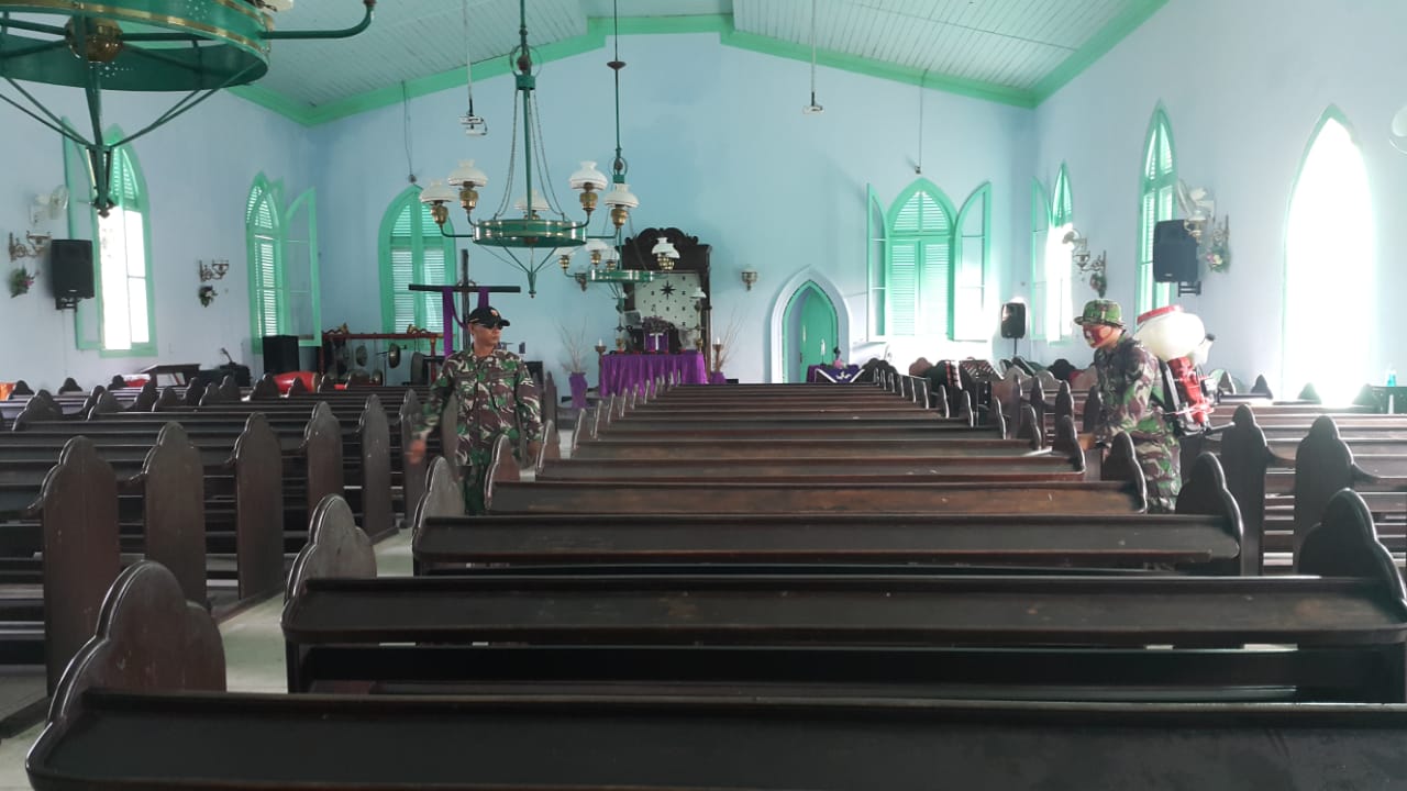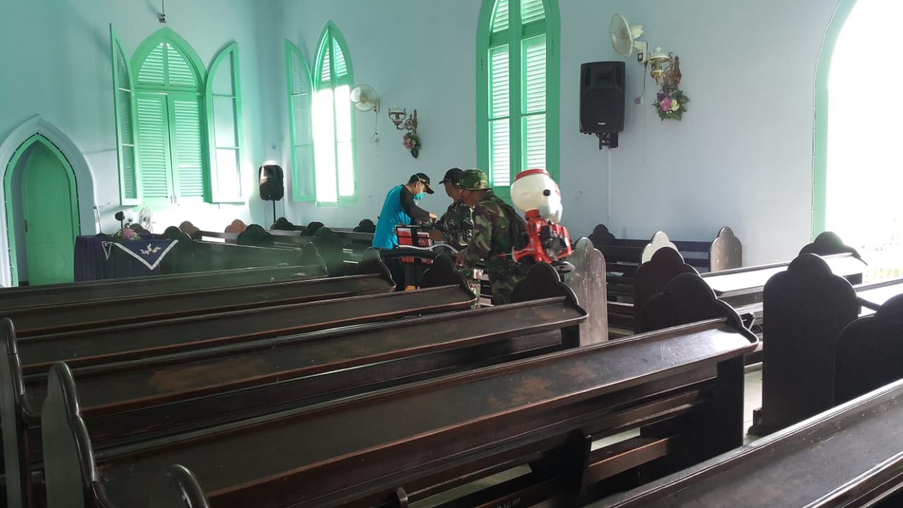 Mojowarno, Mengantisipasi penyebaran virus corona (covid 19) di wilayah binaan, Batituud Koramil 0814/15 bersama anggota koramil 0814/15 dan pengurus GKJW Mojowarno melaksanakan penyemprotan cairan disinfektan untuk pencegahan virus corona atau covid 19, di Gereja Kristen Jawi Wetan, Kecamatan Mojowarno Kabupaten Jombang, Sabtu (28/03/2020).